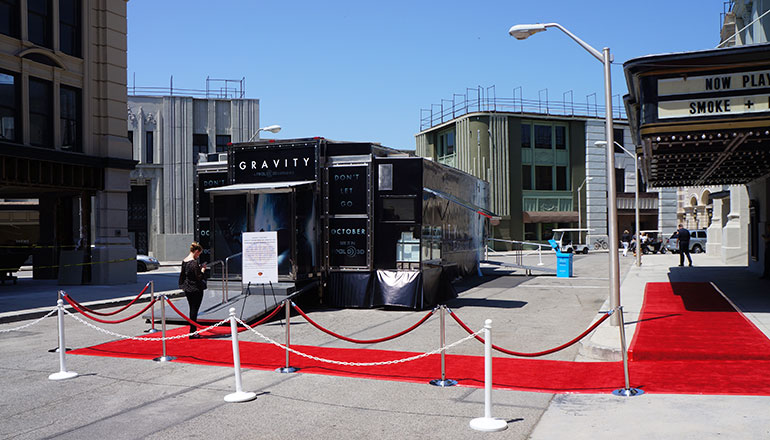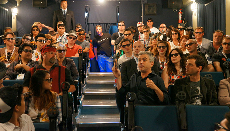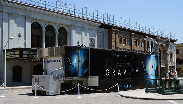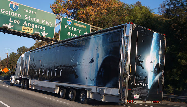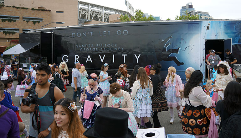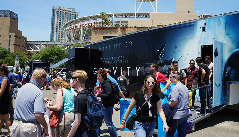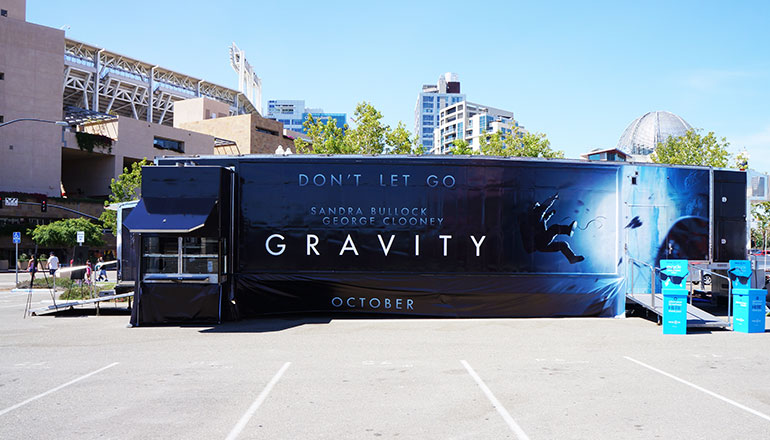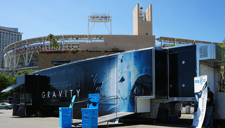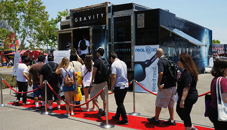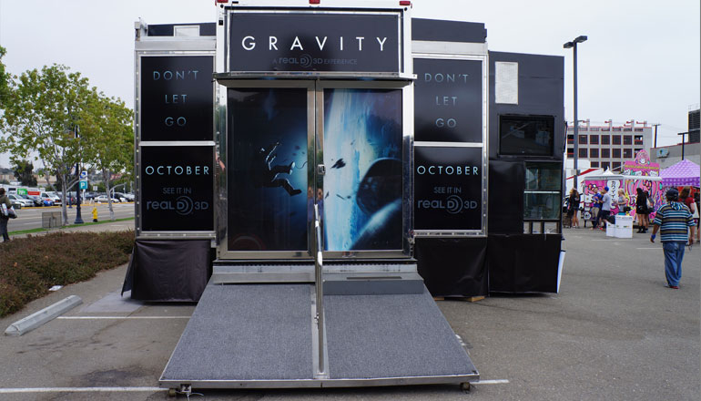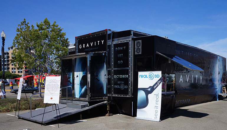 Warner Bros. Entertainment y RealD se unieron para promover el éxito de taquilla en 3D mediante Cinetransformer en el evento “ComicCon International”. Dos características exclusivas de 7 minutos de la aclamada película, se mostró a los espectadores durante todos los días del evento. La unidad estaba completamente envuelta con escenas de la película Gravedad y RealD proporcionó la tecnología 3D así como las gafas para la visión. El centro multimedia en el interior estaba equipado con un proyector compatible 2D/3D NEC DCI y el sonido envolvente a la vanguardia. Más de 11,000 asistentes contó la premier de la película Gravedad en el Cine Móvil. El Director Alfonso Cuarón estaba en el lugar, saludó a la multitud en la zona de los teatros y tomó fotos con los fans en frente del Cinetransformer “Gravedad”.