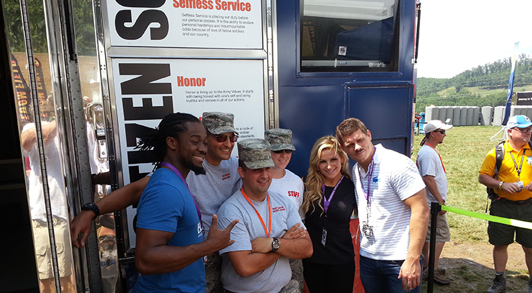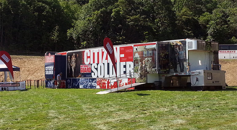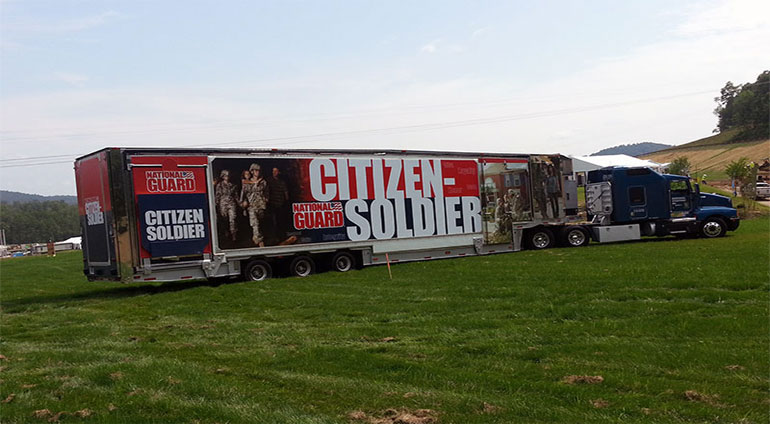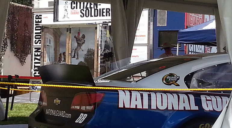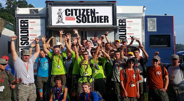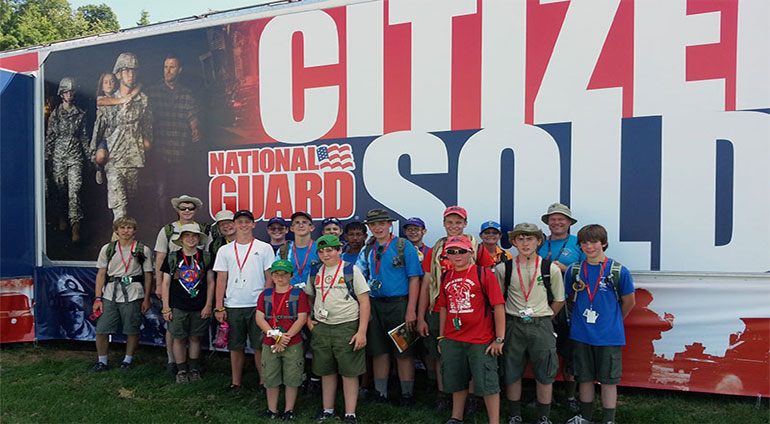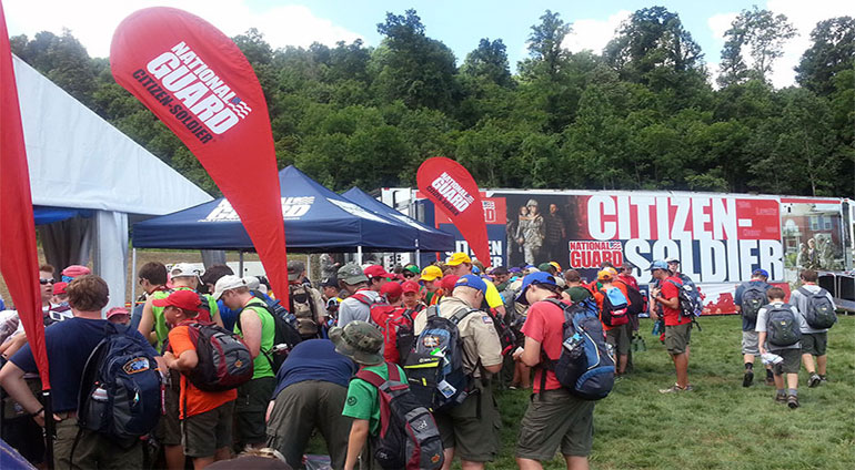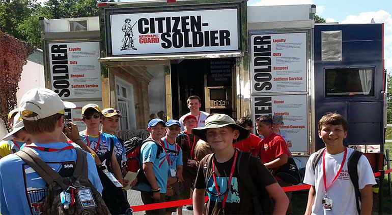 Una vez que los scouts y personal superior se registraron con la Guardia Nacional, se les orientó para que se tomaran fotos con con el coche de Dale Earnhardt Jr. de la “NASCAR Sprint Cup” y el helicóptero “Patriot” de la Guardia Nacional. Los Scouts también recibieron un brazalete con la marca de supervivencia y parches adicionales para su colección. Largas colas se formaron fuera de la Unidad Cinetransformer acondicionada para ver la película "Citizen Soldier" de 6 minutos que representa variedad de eventos y la relación con la Guardia Nacional del Jamboree. Cada día, desde 1,500 hasta 2,000 asistentes entusiastas vieron el cortometraje para ver de primera mano cómo la Guardia Nacional reacciona y sirve a los ciudadanos de la nación en tiempos de necesidad.