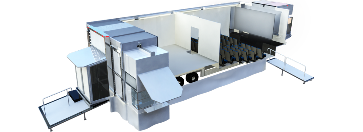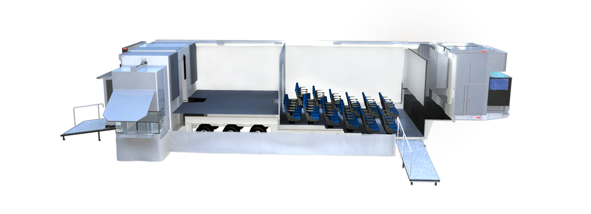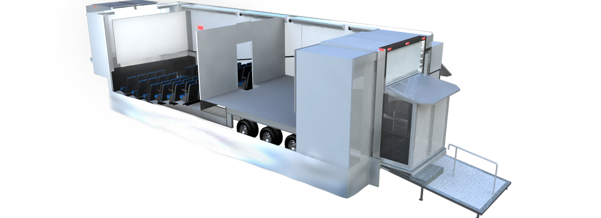 la configuración de Cinetransformer en una unidad de exhibición “Show-Room” es una Unidad expandible que se transforma en cine-móvil con una sala de exposición/exhibición dedicada. Esta unidad Cinetransformer vehículo más grande en su tipo. La configuración interior como sala de exposición/exhibición es extremadamente flexible y se puede utilizar para la exhibición de productos, sala de conferencias, cocina, entrenamiento, estaciones de trabajo, muestreos, demostraciones, sala de estar y/o de reuniones, juegos, etc. Las capacidades de proyección van de 2D, 3D, y 4K hasta sistemas compatibles con DCI.