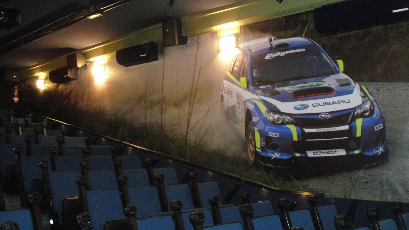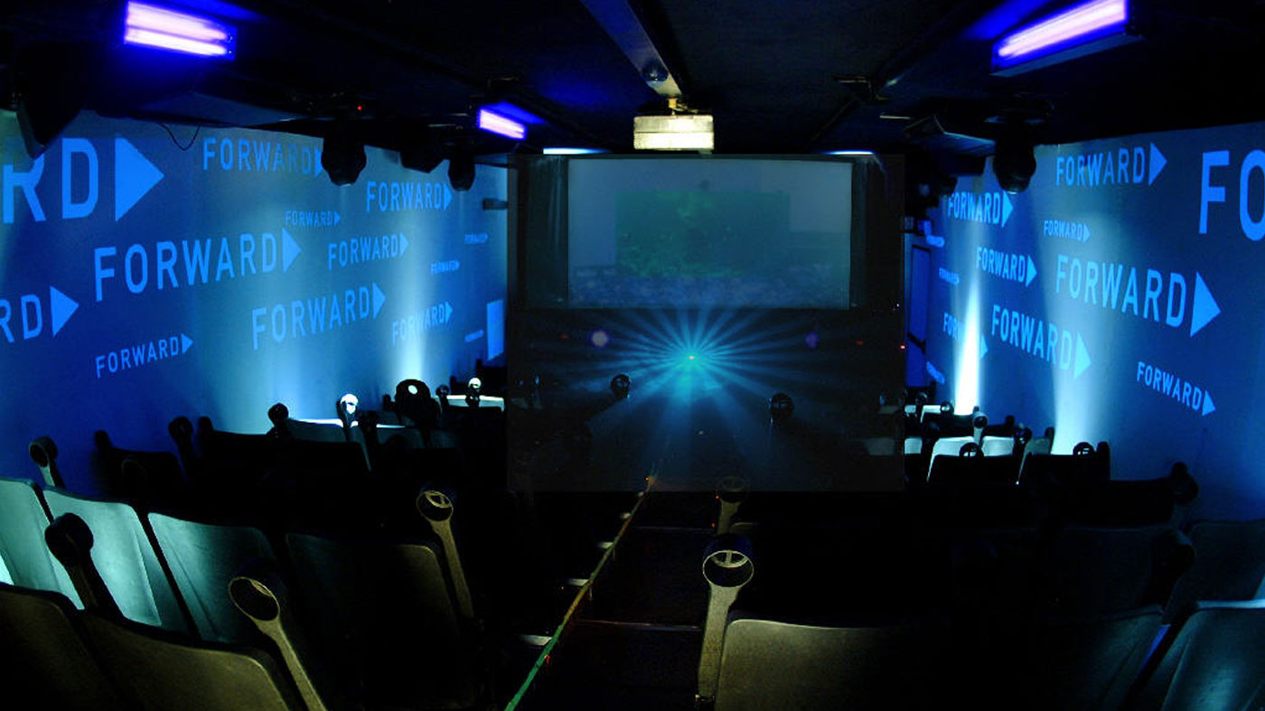 El vestíbulo puede ser completamente acondicionado con la imagen de la marca, cubriendo las paredes del vestíbulo con vinil auto-adherible y la alfombra con la imagen de la marca, se puede instalar en conjunto con la zona del vestíbulo. Debajo de la pantalla de proyección de 14 pies ofrece una excelente ubicación para los logotipos de los clientes, en el que se puede imprimir en vinil micro-perforado. Este material permite que el sonido se pueda transmitir a través de los altavoces, sin afectar la calidad.